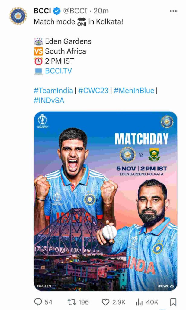 এরপর দুপুর ১২টা ২৪ নাগাদ, ইডেন গার্ডেন্সে আজকের ম্যাচ নিয়ে টুইট করে ভারতের ক্রিকেট কন্ট্রোল বোর্ড। এক্স হ্যান্ডলের সেই বার্তায় তাদের বিবৃতি, ‘ম্যাচ মোডে কলকাতা!’