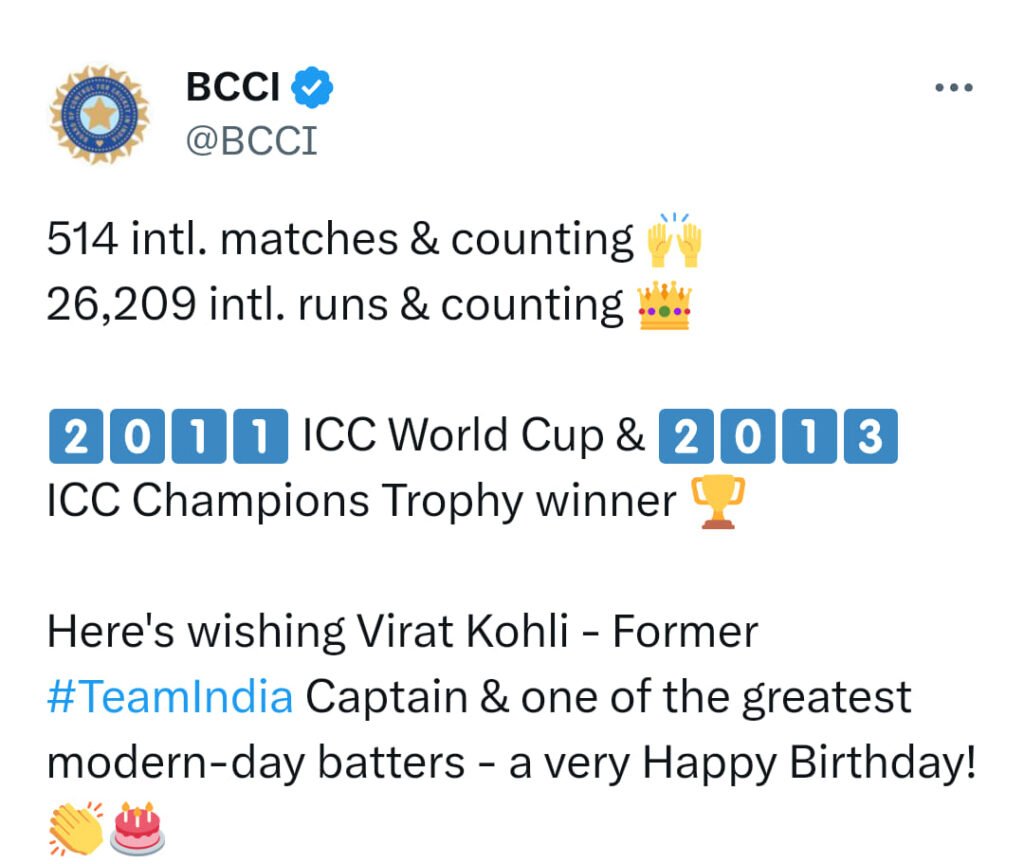 অসাধু টিকিট-চক্রের ধরপাকড়কে পিছনে ফেলে স্বমহিমায় ইডেন গার্ডেন্স। ভারত-দক্ষিণ আফ্রিকা ম্যাচ ঘিরে উন্মাদনা কলকাতায়। বিসিসিআইয়ের জোড়া টুইট তাতিয়েছে ক্রিকেটপ্রেমীদের। এক্স (X, পূর্বনাম Twitter) হ্যান্ডলে সকাল ৯টা নাগাদ বিরাট কোহলিকে জন্মদিনের শুভেচ্ছা জ্ঞাপন করে বিসিসিআই। বিরাটের ছবি সমেত সেই শুভেচ্ছায় শোভা পাচ্ছে ব্যাটার ও প্রাক্তন ভারতীয় অধিনায়ক হিসেবে কোহলি-কীর্তি!