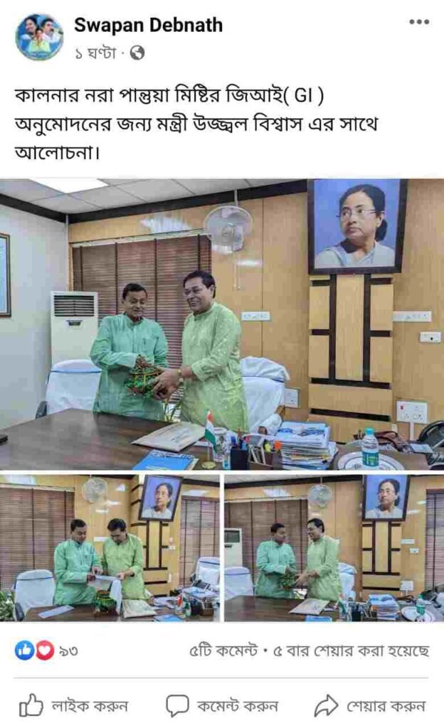 সত্যিই, চেষ্টার কোনও কসুর করছেন না স্বপনবাবু। একভাঁড় নোড়া পান্তুয়া নিয়ে সোজা চলে গিয়েছেন আরেক মন্ত্রী উজ্জ্বল বিশ্বাসের (Ujjwal Biswas) কাছে। বিজয়ার আবহে শুধু মিষ্টিমুখ করা নয়, সেখানে ২ জনে মিলে ঘেঁটে দেখেছেন কালনার অতুলনীয় মিষ্টিটির ইতিহাস, জিআই সম্পর্কিত আইনকানুন, দলিল-দস্তাবেজ! তারপর সেই পান্তুয়ার হক কেন্দ্রিক বৈঠকের ছবি দিয়ে ফেসবুকে স্বকীয় বার্তা পোস্টও করেছেন প্রাণিসম্পদ উন্নয়ন মন্ত্রী।