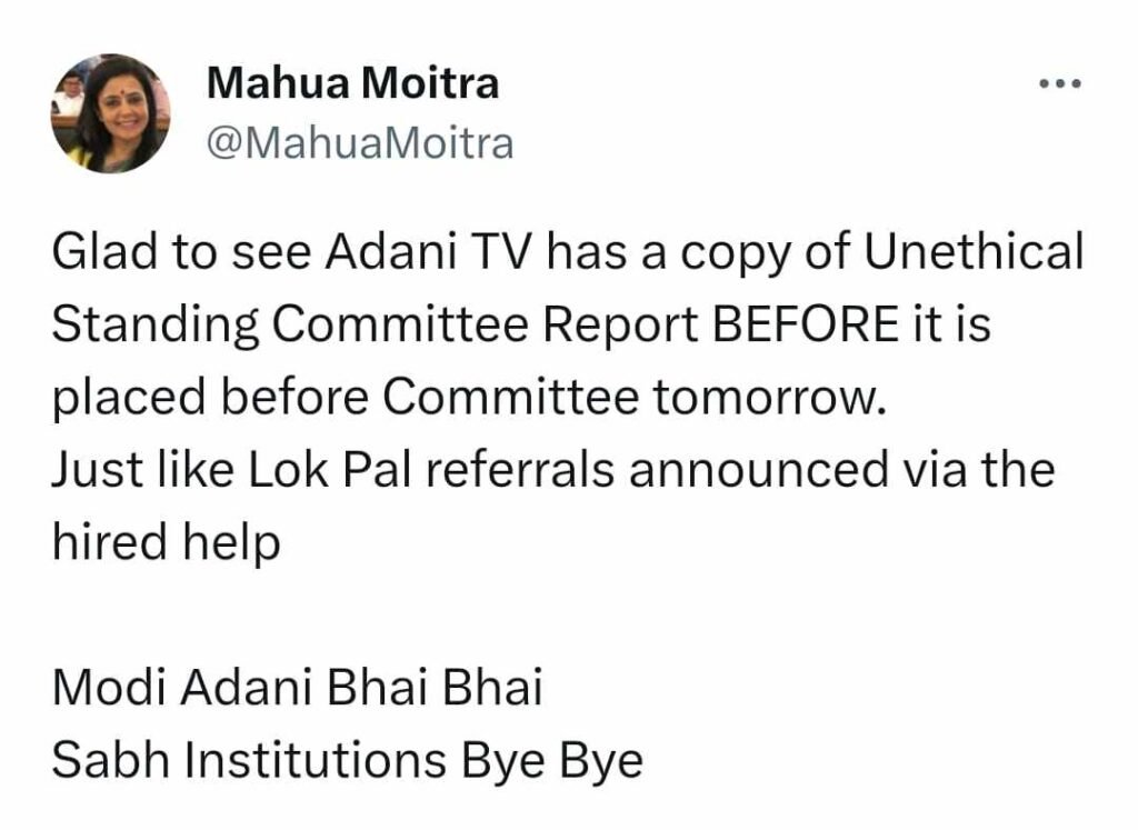 কিন্তু আজ ভোটাভুটির জন্য যে প্রস্তাব আনা হয়েছে, এথিক্স কমিটির সেই ৫০০ পাতা গতকাল কী ভাবে এনডিটিভির (NDTV) হাতে পৌঁছল? প্রশ্নটা হাওয়ায় ঘুরছে। খোদ এথিক্স কমিটিকে কাঠগড়ায় তুলে এবং সংশ্লিষ্ট সংবাদ মাধ্যমের প্রতি তীব্র কটাক্ষ হেনে এক্স (X, পূর্বনাম Twitter) হ্যান্ডলে এই প্রশ্নে আক্রমণ শানিয়েছেন কৃষ্ণনগরের সাংসদও। লোকসভার অধ্যক্ষকেও বিষয়টি জানিয়ে ক্ষোভ প্রকাশ করেছেন তিনি। অর্থাৎ, দমছেন না মহুয়া মৈত্র (Mahua Moitra)।