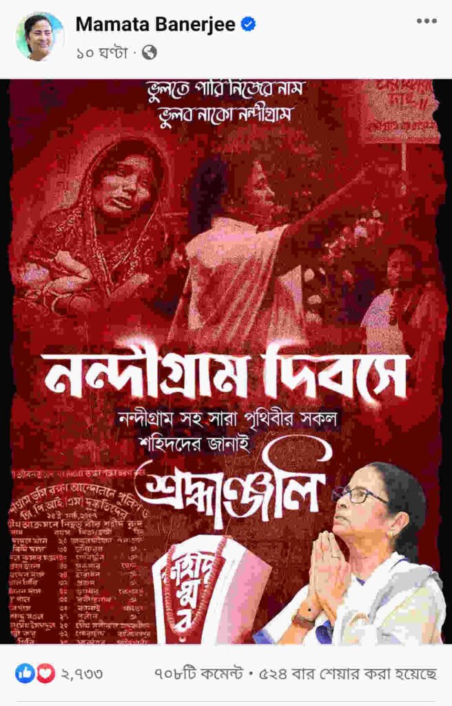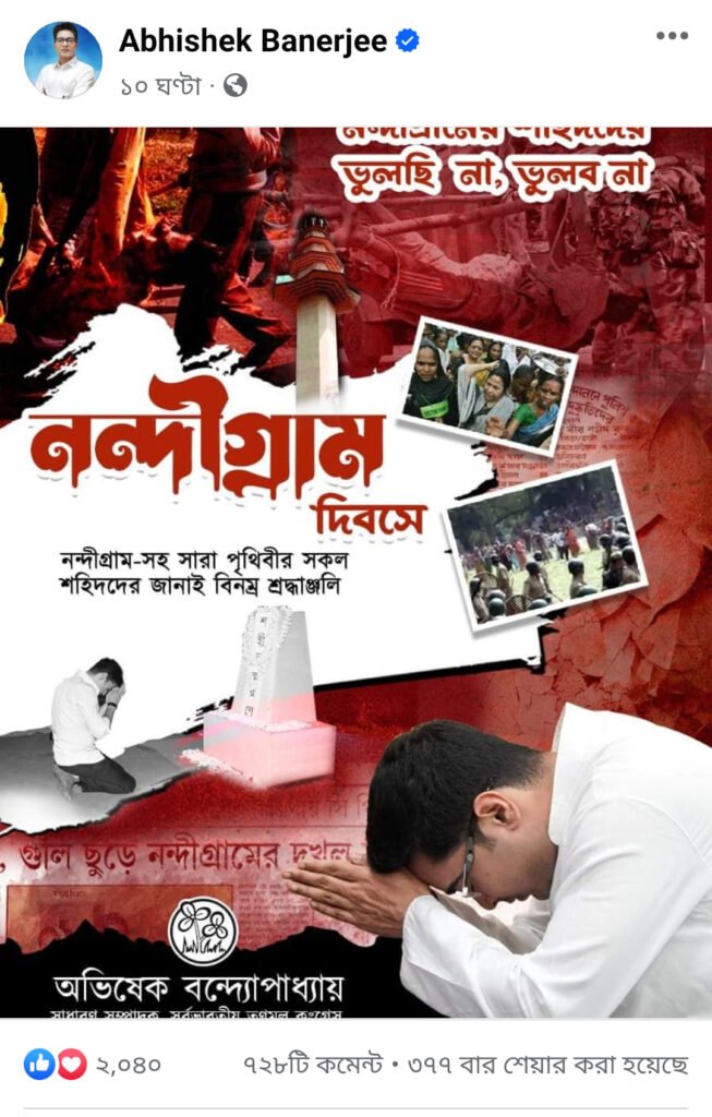 আজ সারাদিন নন্দীগ্রামের শহিদদের প্রতি শ্রদ্ধাজ্ঞাপনের নামে চলল কুণাল-শুভেন্দু তরজা! বিরোধী দলনেতার সঙ্গে তৃণমূল রাজ্য সাধারণ সম্পাদকের সেই বাগবিতণ্ডার মানও পরস্পরকে কালিমালিপ্ত করার ঊর্ধ্বে উঠল না। শুধু মুখ্যমন্ত্রী মমতা বন্দ্যোপাধ্যায় ও তৃণমূলের সর্বভারতীয় সাধারণ সম্পাদক অভিষেক বন্দ্যোপাধ্যায়ের সচিত্র শ্রদ্ধাজ্ঞাপনের পোস্ট ‘স্মৃতিবেদনার মালা’ হয়ে ঝুলে রইল সামাজিক মাধ্যমে।