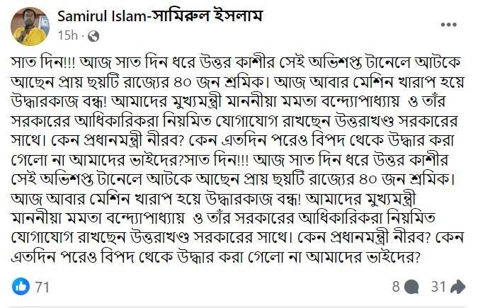 উত্তরকাশীর ভয়ঙ্কর বিপর্যয় কি কেন্দ্রে ক্ষমতাসীন সরকারের নিদ্রাভঙ্গের পক্ষে যথেষ্ট কারণ নয়? সাংসদ সামিরুল ইসলামের পোস্ট থেকে এই জিজ্ঞাসা তীব্র সূচিমুখ খুঁজে পাচ্ছে। তবে তা শাসকের ‘শৌখিন বিলাসে’ বিন্দুমাত্র ব্যাঘাত তৈরি করবে কি? সংশয়ে বিরোধীরা।