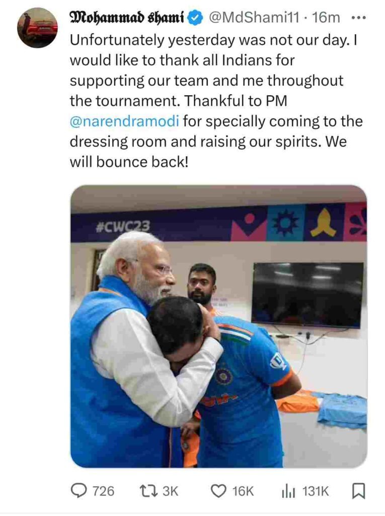 এক্স (X, পূর্বনাম Twitter) হ্যান্ডলে নরেন্দ্র মোদীর আলিঙ্গনের ছবি পোস্ট করে শামি আজ লিখেছেন—