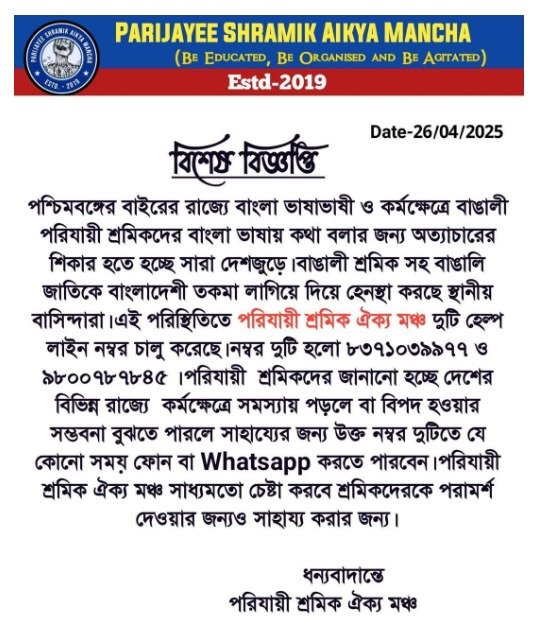 কাশ্মীরের পহেলগাঁওয়ে জঙ্গি হামলার পর দেশের বিভিন্ন প্রান্তে বাংলার পরিযায়ী শ্রমিকদের ওপর অত্যাচার করা হচ্ছে। বিজেপি শাসিত গুজরাটে বহু বাংলার পরিযায়ী শ্রমিক মুসলিম হওয়ার কারণে তাদের বাংলাদেশি তকমা দিয়ে অত্যাচার করা হচ্ছে এবং তাড়িয়ে দেওয়া হচ্ছে। ইতিমধ্যেই বিপদে পড়া এইসব পরিযায়ী শ্রমিকদের সব রকম সাহায্য করে পশ্চিমবঙ্গে ফিরিয়ে আনার ব্যবস্থা করেছেন পশ্চিমবঙ্গ পরিযায়ী শ্রমিক কল্যাণ পর্ষদ। চেয়ারম্যান রাজ্যসভার সাংসদ সব রকম উদ্যোগ গ্রহণ করেছেন। বিশেষ হেল্প আই নম্বরের সাহায্যে দেশের বিভিন্ন প্রান্তে আক্রান্ত বাংলার পরিযায়ী শ্রমিকদের সব রকম সহযোগিতা করা হচ্ছে।
