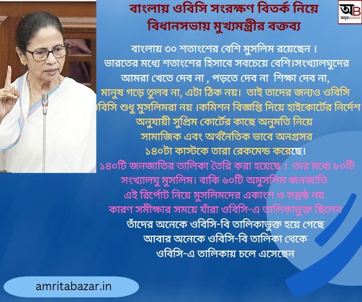 বাংলায় ৩০ শতাংশের বেশি মুসলিম রয়েছেন। ভারতের মধ্যে শতাংশের হিসাবে সবচেয়ে বেশি।সংখ্যালঘুদের আমরা খেতে দেব না, পড়তে দেব না, শিক্ষা দেব না, মানুষ গড়ে তুলব না, এটা ঠিক নয়।  তাই তাদের জন্যও ওবিসি। ওবিসি শুধু মুসলিমরা নয়। কমিশন বিজ্ঞপ্তি দিয়ে হাইকোর্টের নির্দেশ অনুযায়ী,  সুপ্রিম কোর্টের কাছে অনুমতি নিয়ে সামাজিক এবং অর্থনৈতিক ভাবে অনগ্রসর  ১৪০টা কাস্টকে তারা রেকমেন্ড করেছে।   ১৪০টি জনজাতির তালিকা তৈরি করা হয়েছে।  তার মধ্যে ৮০টি সংখ্যালঘু মুসলিম।  বাকি ৬০টি অমুসলিম জনজাতি। দেশের খুব নামী সংস্থাকে দিয়ে সমীক্ষা চালানো হয়েছে। তবু তাদের এই রির্পোট নিয়ে মুসলিমদের একাংশ ও সন্তুষ্ঠ নয়।,  কারণ সমীক্ষার সময়ে যাঁরা ওবিসি-এ তালিকাভুক্ত ছিলেন তাঁদের অনেকে ওবিসি-বি তালিকাভুক্ত হয়ে গেছে  আবার অনেকে ওবিসি-বি তালিকা থেকে  ওবিসি-এ তালিকায় চলে এসেছেন। সেক্ষেত্রে কমিশন সাংবাদিক সম্মেলন করে জানিয়েছে যদি এ বিষয়ে কারও ক্ষোভ থাকে তারা আবেদন করতে পারে। পরে তাদের সেই আবেদন আবার বিচার বিবেচনার সুযোগ থাকছে।