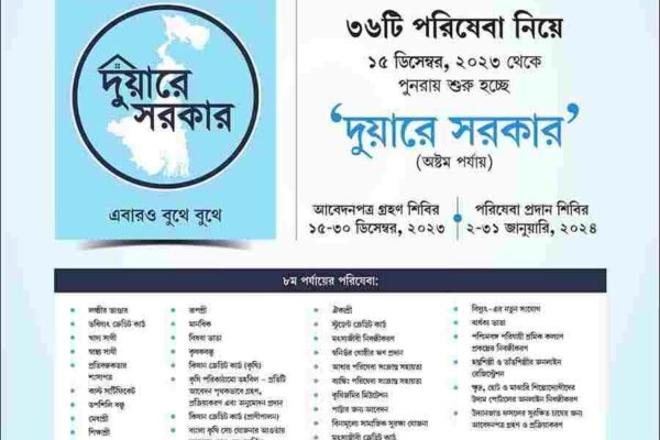 ১৫ ডিসেম্বর শুক্রবার থেকে রাজ্যে শুরু হল অষ্টম ‘দুয়ারে সরকার’ (Duare Sarkar) শিবির। ২০২৪-এর লোকসভা নির্বাচনের আগেই, মুখ্যমন্ত্রী মমতা বন্দ্যোপাধ্যায়ের (Mamata Banerjee) লক্ষ্য, রাজ্যের সাধারণ মানুষের কাছে নানান সরকারি প্রকল্পের সুবিধা পৌঁছে দেওয়া। এই অষ্টম ‘দুয়ারে সরকার’ শিবিরে সরকারি প্রকল্পের আবেদনপত্র জমার কাজ চলবে ছুটির দিন বাদে ৩১ ডিসেম্বর পর্যন্ত। পরিষেবা প্রদান চলবে ২ জানুয়ারি…